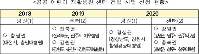 Áö³ÇرîÁö °ø°ø¾î¸°ÀÌÀçȰº´¿ø 2°³¼Ò, ÀçȰÀÇ·á¼¾ÅÍ 4°³¼Ò µîÀ» °Ç¸³ ¹× ÃßÁøÇߴµ¥, ¿©±â¿¡ ´õÇØ Àü³²±Ç°ú °æºÏ±Ç µîÀ» ´ë»óÀ¸·Î ±Ç¿ªº° 2°³¾¿ ÃÑ 4°³ ½Ã·µµ ¹× ¼¾Å͸¦ ¼±Á¤ÇÒ ¹æÄ§ÀÌ´Ù.