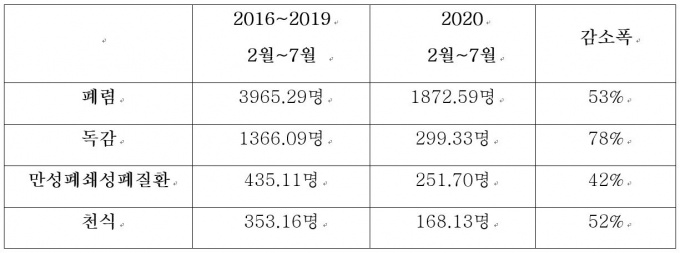 ¿¬±¸ÆÀÀº ±¹¹Î°Ç°º¸Çè û±¸ ÀڷḦ ÀÌ¿ëÇØ¼ COVID-19 À¯Çà ÀüÀÎ 2016³âºÎÅÍ 2019³â±îÁö 2¿ù~7¿ù°£, 4°¡Áö ÁÖ¿ä È£Èí±â Áúȯ(Æó·Å, µ¶°¨, ¸¸¼ºÆó¼â¼ºÆóÁúȯ(COPD), õ½Ä)À¸·Î ÀÎÇÑ ÀÔ¿øÀ²°ú ±¹³» COVID-19 À¯ÇàÀÌ º»°ÝÈµÈ 2020³â2¿ùºÎÅÍ 7¿ù±îÁöÀÇ ÀÔ¿øÀ²À» ºñ±³ ºÐ¼®Çß´Ù.