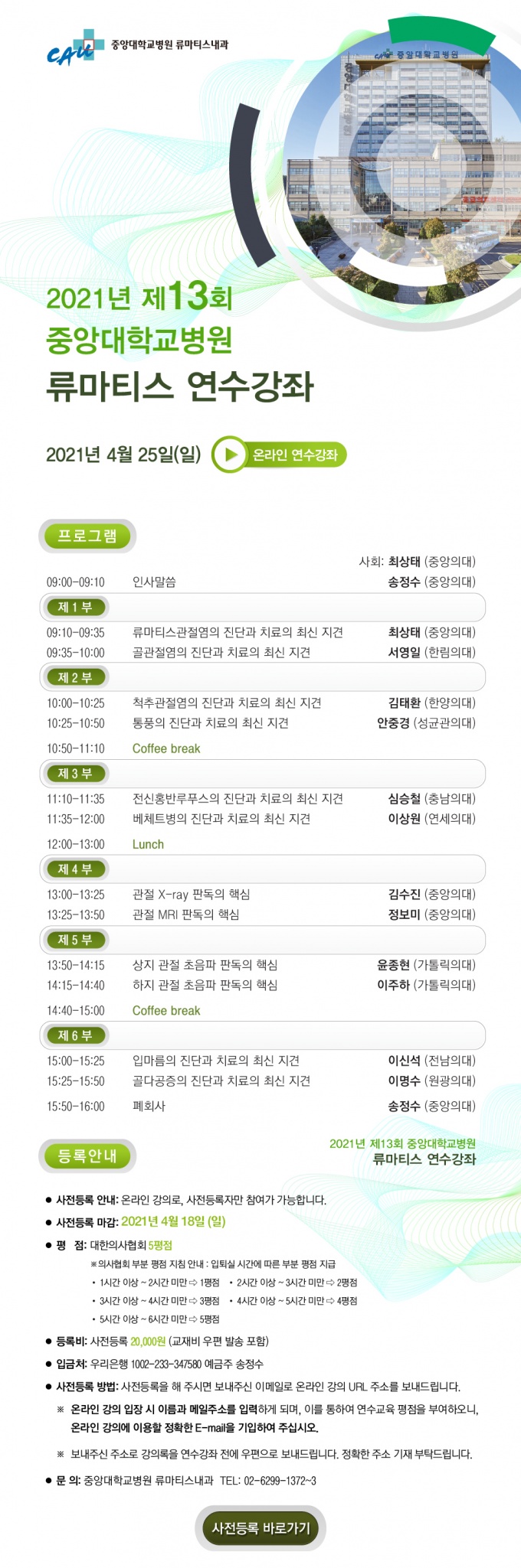 À̹ø ¿¬¼ö°Á´ ¿Â¶óÀÎ µî·ÏÀ» ÅëÇØ 4¿ù 18ÀϱîÁö »çÀüµî·ÏÀÌ °¡´ÉÇϸç, °ÀÇ À̼ö½Ã°£ º°·Î ÃÖ´ë ´ëÇÑÀÇ»çÇùȸ ÆòÁ¡ 5Á¡ÀÌ ºÎ°úµÈ´Ù. ±âŸ ÀÚ¼¼ÇÑ ¹®ÀÇ»çÇ×Àº Á߾Ӵ뺴¿ø ·ù¸¶Æ¼½º³»°ú·Î ¿¬¶ôÇÏ¸é µÈ´Ù. |