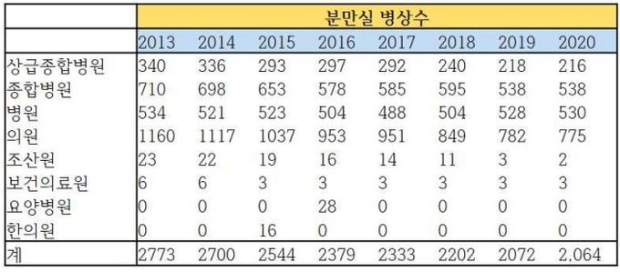 2013³â 1554°³¿´´ø ºÐ¸¸ º´½Ç¼ö´Â 2020³â 1338°³·Î 216°³ ÁÙ¾ú´Ù. ºñÀ²·Î´Â 13.89% °¨¼Ò´Ù. ¹«¾ùº¸´Ù »ó±ÞÁ¾ÇÕº´¿ø°ú ÀÇ¿ø±Þ ÀÇ·á±â°ü °¨¼Ò¼¼°¡ È®¿¬ÇÏ´Ù.