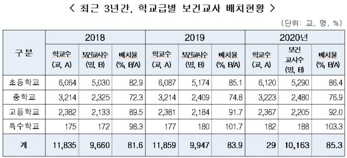 2020³â ±âÁØÀ¸·Î Àü±¹ ÃʵîÇб³, ÁßÇб³, °íµîÇб³, Ư¼öÇб³¿¡ ¹èÄ¡µÈ º¸°Ç±³»ç´Â 1¸¸163¸íÀ¸·Î, ¹èÄ¡À²Àº 85.3% ¼öÁØÀÌ´Ù.