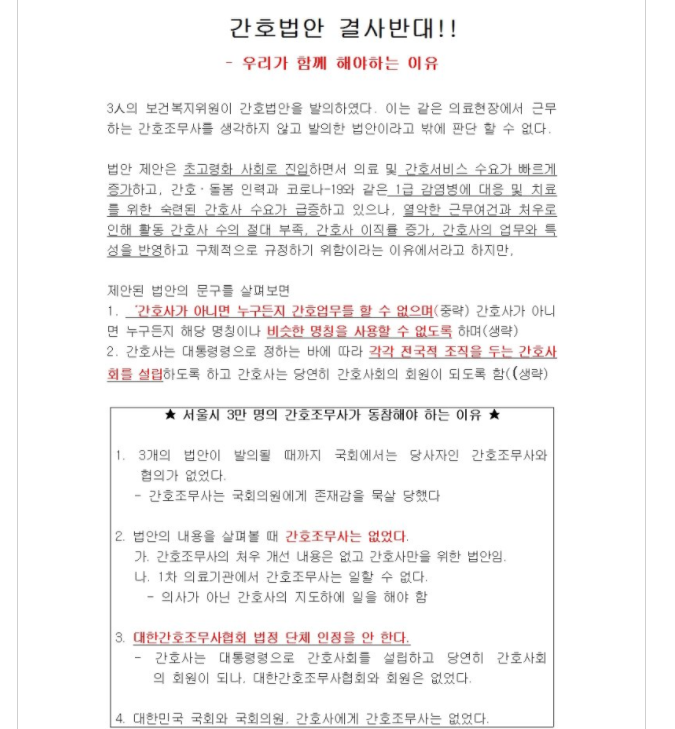 ±×´Â “¹ý¾ÈÀÌ ¹ßÀÇµÉ ¶§±îÁö ±¹È¸´Â ´ç»çÀÚÀÎ °£È£Á¶¹«»ç¿ÍÀÇ ÇùÀǰ¡ ¾ø¾ú´Ù. ¹ý¾È ³»¿ë¿¡µµ °£È£Á¶¹«»ç ó¿ì °³¼± ³»¿ëÀº ¾ø°í °£È£»ç¸¸À» À§ÇÑ ¹ý¾È”À̶ó¸ç “¹ý¾ÈÀÌ Åë°úµÇ¸é 1Â÷ ÀÇ·á±â°ü¿¡¼ °£È£Á¶¹«»ç´Â Àǻ簡 ¾Æ´Ñ °£È£»ç ÁöµµÇÏ¿¡ ÀÏÇØ¾ß Çϱ⠶§¹®¿¡ ±Ù¹«ÇÒ ¼ö ¾ø°Ô µÈ´Ù”°í ¸»Çß´Ù.