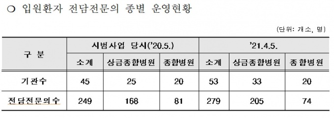 ÇÏÁö¸¸ Á¾ÇÕº´¿ø ¼Ò¼Ó ÀÔ¿øÀü´ãÀü¹®ÀÇ ¼ö´Â ¿ÀÈ÷·Á ÁÙ¾îµé¾ú´Ù. Áö³ÇØ 5¿ù ½Ã¹ü»ç¾÷´ç½Ã 81¸íÀ¸·Î Áý°èµÆÁö¸¸, º»»ç¾÷ÀÌ ½Ç½ÃµÈ ÈÄ 3°³¿ù ¿© Áö³ ÀÌ´Þ 5ÀÏ ±âÁØ, 7¸íÀÌ ÁÙ¾îµç 74¸íÀ¸·Î Áý°èµÆ´Ù. Âü¿©±â°ü ¼ö´Â 20°³·Î µ¿ÀÏÇß´Ù.