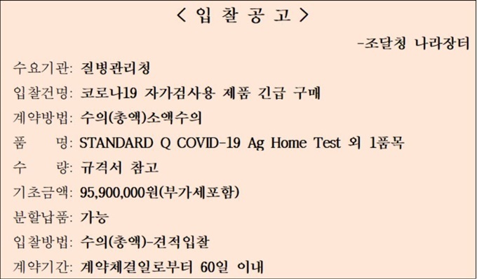 7ÀÏ ÀüºÀ¹Î ¹«¼Ò¼Ó ÀÇ¿ø¿¡ µû¸£¸é Áúº´°ü¸®Ã»(Áúº´Ã»)Àº Áö³ 6ÀÏ Äڷγª19 ÀÚ°¡°Ë»çŰƮ ±¸¸Å¸¦ À§ÇÑ ‘Äڷγª19 ÀÚ°¡°Ë»ç¿ë Á¦Ç° ±ä±Þ ±¸¸Å’¸¦ Á¶´Þû ÀÔÂû°ø°í¸¦ ÅëÇØ ¹ßÁÖÇÑ °ÍÀ¸·Î ³ªÅ¸³µ´Ù.