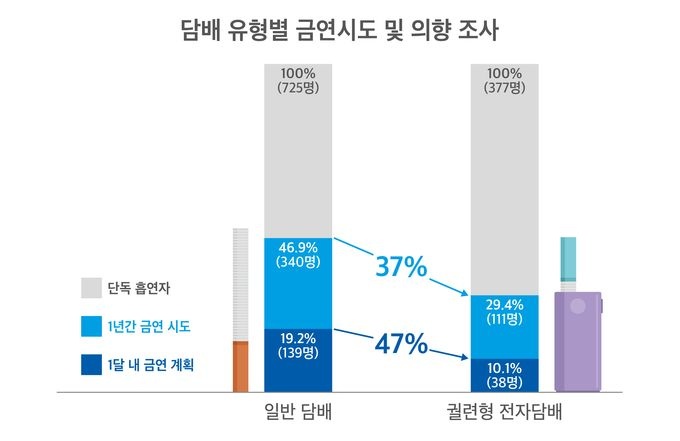 Áö³ 1³â°£ ±Ý¿¬ ½Ãµµ¸¦ ÇÑ ÀûÀÌ ÀÖ´À³Ä´Â Áú¹®¿¡ ÀϹݴã¹è Èí¿¬ÀÚ´Â 55.6%°¡, ¾×»óÇü ÀüÀÚ´ã¹è¿Í ±È·ÃÇü ÀüÀÚ´ã¹è Èí¿¬ÀÚ´Â 46.7%, 39.6%°¡ ±Ý¿¬ ½Ãµµ¸¦ ÇÑ ÀûÀÌ ÀÖ´Ù°í ´äÇß´Ù.