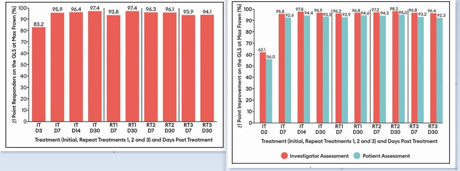 µÎ Â÷·ÊÀÇ ÀÓ»ó(EV-004·EV-006)¿¡¼ ¹Ýº¹ ½Ã¼ú ÈÄ 30Àϰ¿¡ 1´Ü°è ÀÌ»ó ÁÖ¸§ÀÌ °³¼±µÈ ºñÀ²Àº °¢°¢ 97.1%¿Í 96.4%´Ù.