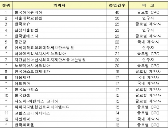 ½ÄǰÀǾàǰ¾ÈÀüó¿Í ±¹°¡ÀÓ»ó½ÃÇèÁö¿øÀç´ÜÀÌ ¹ßÇ¥ÇÑ ÀÓ»ó½ÃÇè ½ÂÀÎÇöȲ¿¡ µû¸£¸é Áö³ÇØ ÀÓ»ó ½ÂÀÎ °Ç¼ö »óÀ§ 20°³ ±â°ü Áß ±¹³» Á¦¾à»ç´Â ÃÑ 4°÷ÀÌ Æ÷ÇԵƴÙ.