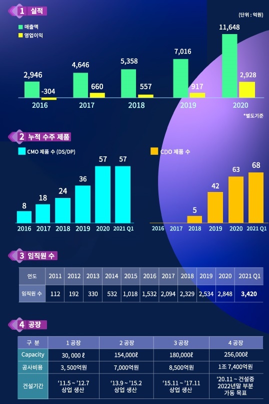 [µ¥Àϸ®¸Þµð ¾çº¸Çý ±âÀÚ] »ï¼º¹ÙÀÌ¿À·ÎÁ÷½ºÀÇ '¼±Åðú ÁýÁß' Àü·«ÀÌ ÅëÇß´Ù. ¸ðµç °ÍÀ» ÀßÇϱ⺸´Ù »ï¼ºÀÌ ÃàÀûÇÑ Á¦Á¶¾÷¿¡¼ÀÇ ³ëÇϿ츦 ¹ÙÀÌ¿À »ê¾÷¿¡ Á¢¸ñ½ÃÄÑ ÁýÁß À°¼ºÇÑ 'À§Å¹»ý»ê(CMO)'ÀÇ Æø¹ßÀûÀÎ ¼ºÀåÀ¸·Î 2020³â óÀ½ ¸ÅÃâ 1Á¶¿øÀ» µ¹ÆÄÇß´Ù. ±¹³» CMO èÇǾðÀ¸·Î µî±ØÇÑ »ï¼º¹ÙÀÌ¿À·ÎÁ÷½º´Â À§Å¹°³¹ß(CDO)·Î ¿Ü¿¬À» ³ÐÈ÷°í ¼¼°è ÃÖ´ë ±Ô¸ðÀÌÀÚ ½´ÆÛÇ÷£Æ®·Î ¼³°èµÈ 4°øÀå °Ç¼³¿¡ ³ª¼¸ç ¹ÙÀÌ¿À ÃʰÝÂ÷ ½Ã´ë¸¦ ¿°í ÀÖ´Ù. ¿©±â¿¡ ¹®ÀçÀÎ ´ëÅë·É°ú ¹ÙÀÌµç ´ëÅë·ÉÀÇ ÇÑ¹Ì Á¤»óȸ´ã ÃÖ´ë ¼º°ú·Î ²ÅÈ÷´Â ¸ð´õ³ª¿ÍÀÇ Äڷγª19 ¹é½Å À§Å¹»ý»ê °è¾à±îÁö ü°áÇÏ¸é¼ Àü¼¼°èÀû À§±â ¼Ó¿¡ 'ÀηùÀÇ ´õ ³ªÀº ³»ÀÏ¿¡ ±â¿©ÇÑ´Ù'´Â »ç¸íÀ» ½ÇõÇϰí ÀÖ´Ù. ÀÌ·± ±â¼¼¸¦ ¸ô¾Æ ⸳ 10ÁÖ³âÀ» ¸ÂÀº ¿ÃÇØ ¸ñÇ¥´Â '2030³â ±Û·Î¹ú Å鯼¾î ¹ÙÀÌ¿À ±â¾÷ µµ¾à'ÀÌ´Ù. Á¸¸² »ï¼º¹ÙÀÌ¿À·ÎÁ÷½º ´ëÇ¥[»çÁø]´Â "Áö³ 10³â µ¿¾È ´Ù°¢ÈµÈ »ç¾÷ È®ÀåÀ» ÅëÇØ ±Û·Î¹ú Á¾ÇÕ¹ÙÀÌ¿À±â¾÷À¸·Î ¹ßµ¸¿òÇϰڴÙ"°í ¼±¾ðÇß´Ù.