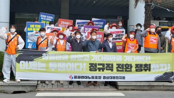 27ÀÏ °æ»ó±¹¸³´ëº´¿ø ºñÁ¤±ÔÁ÷ ³ëµ¿ÀÚµéÀÌ ±âÀÚȸ°ßÀ» °®°í Á¤±ÔÁ÷ Àüȯ ±¸È£¸¦ ¿ÜÄ¡°í ÀÖ´Ù.