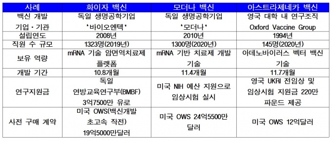¼¼ ȸ»ç ¸ðµÎ ÀÛ³â 1¿ùºÎÅÍ ¹é½Å °³¹ß¿¡ µ¹ÀÔÇß´Ù. mRNA ±â¹ÝÀÇ ÈÀÌÀÚ¿Í ¸ð´õ³ª ¹é½ÅÀº ¹Ì±¹¿¡¼ °°ÀºÇØ 12¿ù 2Àϰú 12¿ù 9ÀÏ °¢°¢ Çã°¡ ¹Þ¾Ò°í, ¹ÙÀÌ·¯½º º¤ÅÍ ±â¹Ý AZ ¹é½ÅÀº 12¿ù 30ÀÏ ¿µ±¹¿¡¼ Çã°¡¸¦ ȹµæÇß´Ù.