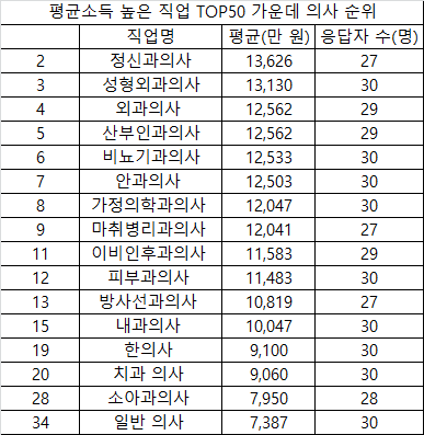 À̹ۿ¡ ¾È°úÀǻ緰¡Á¤ÀÇÇаúÀǻ緸¶Ã뺴¸®°úÀÇ»ç·À̺ñÀÎÈİúÀǻ緹æ»ç¼±°úÀǻ緳»°úÀǻ緼ҾưúÀÇ»ç·ÀϹÝÀÇ»ç µîÀÌ 50°³ Á÷¾÷ ¾È¿¡ Æ÷ÇԵƴÙ. Àü¹®ÀÇ °¡¿îµ¥¼´Â ¼Ò¾Æ°úÀÇ»ç Æò±Õ ¼ÒµæÀÌ 7950¸¸¿øÀ¸·Î °¡Àå ³·¾Ò´Ù.