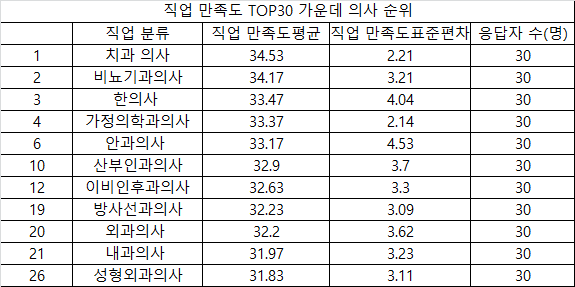 ¶ÇÇÑ Á÷¾÷º°·Î ¼¼ºÐÇßÀ» °æ¿ì Á÷¾÷ ¸¸Á·µµ°¡ °¡Àå ³ôÀº 30°³ °¡¿îµ¥ 1À§´Â Ä¡°úÀǻ翴À¸¸ç ºñ´¢±â°úÀÇ»ç´Â 2À§, °¡Á¤ÀÇÇаúÀǻ簡 4À§ µîÀ» Â÷ÁöÇß´Ù. ¼ºÇü¿Ü°úÀÇ»ç´Â 26À§·Î ÀÇ»ç °¡¿îµ¥¼´Â °¡Àå ³·¾Ò´Ù.