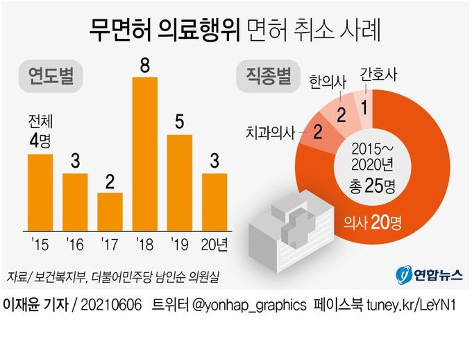 6ÀÏ ´õºÒ¾î¹ÎÁÖ´ç ³²Àμø ÀÇ¿ø½ÇÀÌ º¸°Çº¹ÁöºÎ¿¡¼ ¹ÞÀº ÀÚ·á¿¡ µû¸£¸é 2015∼2020³â ¹«¸éÇã ÀÇ·áÇàÀ§¸¦ ½ÃŲ ÀÇ·áÀÎÀÇ ¸éÇãÃë¼Ò´Â ÃÑ 25°ÇÀ̾ú´Ù.
