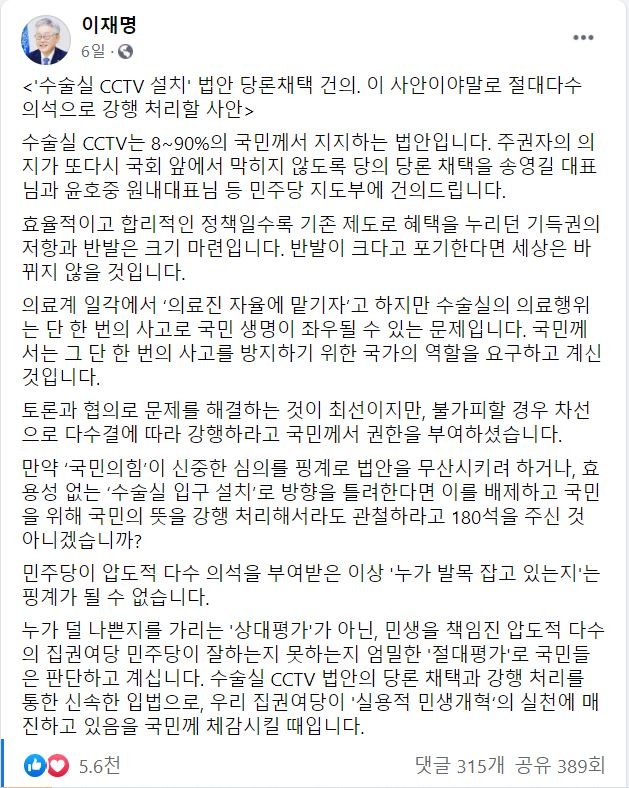 [µ¥Àϸ®¸Þµð °íÀç¿ì ±âÀÚ] ÀÌÀç¸íÇ¥ º¸°ÇÀÇ·áÁ¤Ã¥ Áß ÇϳªÀÎ ¼ö¼ú½Ç CCTV ¼³Ä¡ ³»¿ëÀ» ´ãÀº ÀÇ·á¹ý °³Á¤¾ÈÀÌ ÈûÀ» ¹Þ°í ÀÖ´Ù.
