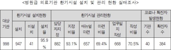 ½ÇÁ¦·Î ÃÖ ÀÇ¿ø½ÇÀÌ º¸°Çº¹ÁöºÎ·ÎºÎÅÍ Á¦Ãâ ¹ÞÀº ‘º´¿ø±Þ ÀÇ·á±â°ü ȯ±â½Ã¼³ ¼³Ä¡ ¹× °ü¸® ÇöȲ ½ÇÅÂÁ¶»ç’¿¡ µû¸£¸é ȯ±â½Ã¼³ ¼³Ä¡°¡ Àǹ«ÈµÆÀ½¿¡µµ ºÒ±¸Çϰí À̸¦ ¼³Ä¡ÇÏÁö ¾ÊÀº ±â°üÀÌ 41°³¼Ò(4.1%)³ª µÆ´Ù.