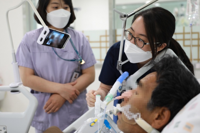 »çÁø-¿ï»ê´ëº´¿ø¿¡¼ Ä¡·áÁßÀÎ Äڷγª19 ÁßÁõ ȯÀÚ°¡ ÇÚµåÆùÀ» »ç¿ëÇØ °¡Á·°ú È»ó¸éȸ ÁßÀÌ´Ù.