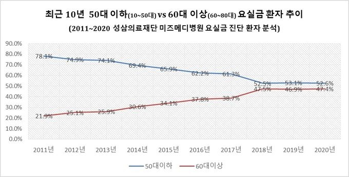 ƯÈ÷ 2018³â¿¡´Â 50´ë¿Í 60´ëÀÇ ¿ä½Ç±Ý ȯÀÚÀÇ ºñÀ²ÀÌ 29.9%·Î µ¿ÀÏÇß°í, 2019³â¿¡´Â 50´ë 26.3%, 60´ë 27.5%, 2020³â¿¡´Â 50´ë 25.5%, 60´ë 28.7%·Î ¿ªÀüµÆ´Ù.