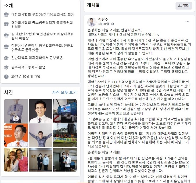 »çÁø¼³¸í: ÀÌÇʼö ´ëÇÑÀÇ»çÇùȸ ȸÀåÀÌ ´ç¼± Á÷ÈÄ ¸¶Áö¸·À¸·Î ÆäÀ̽ººÏ¿¡ ³²±ä ±Û. ÀÌÈÄ ÀÌ È¸ÀåÀÇ SNS Ȱµ¿Àº ã¾Æº¸±â ¾î·Æ´Ù.