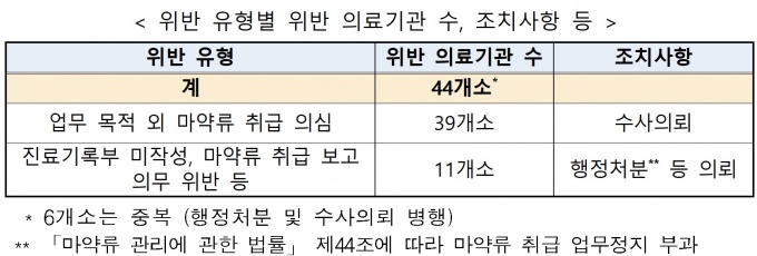 Àû¹ßµÈ 44°³¼ÒÀÇ À§¹Ý À¯ÇüÀº ¡ã¿À‧³²¿ë ó¹æ‧Åõ¾à µî ¾÷¹« ¸ñÀû ¿Ü ¸¶¾à·ù Ãë±Þ ÀǽÉ(39°³¼Ò) ¡ãÁø·á±â·ÏºÎ ¹ÌÀÛ¼º ¹× ¸¶¾à·ù Ãë±Þ º¸°í Àǹ« À§¹Ý(11°³¼Ò) µîÀÌ´Ù.