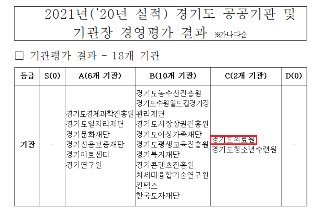 [µ¥Àϸ®¸Þµð ÀÓ¼ö¹Î ±âÀÚ] °æ±âµµÀÇ·á¿øÀÌ °æ±âµµ »êÇÏ °ø°ø±â°üÀÇ °æ¿µ½ÇÀû Æò°¡ °á°ú, 3³â ¿¬¼Ó Cµî±Þ¿¡ ¸Ó¹«¸£¸ç Æò°¡ ±â°ü Áß ÃÖÇÏÀ§¸¦ Â÷ÁöÇß´Ù.
