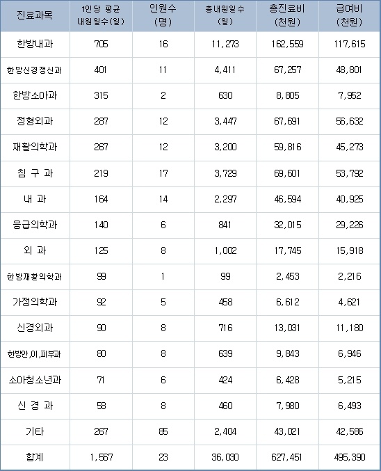 ¿ä¾ç±â°ü Á¾º°·Î´Â ÇÑÀÇ¿ø(1ÀÎ´ç Æò±Õ ³»¿øÀϼö 1154ÀÏ·ÃÑÁø·áºñ 3¾ï2028¸¸4000¿ø), ÀÇ¿ø(424ÀÏ·1¾ï7007¸¸¿ø), Á¾ÇÕº´¿ø(290ÀÏ·6787¸¸¿ø), º´¿ø(148ÀÏ·4454¸¸¿ø), ¿ä¾çº´¿ø(138ÀÏ·1858¸¸7000¿ø), »ó±ÞÁ¾ÇÕº´¿ø(11ÀÏ·461¸¸2000¿ø), Çѹ溴¿ø(7ÀÏ·23¸¸4000¿ø) µîÀ¸·Î Áý°èµÆ´Ù.