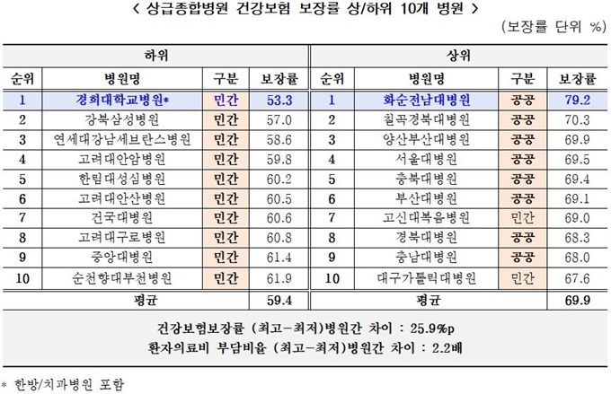 ¹Î°£º´¿øÀÎ °æÈñ´ëº´¿øÀ» Æ÷ÇÔÇØ °Ç°º¸Ç躸Àå·ü ÇÏÀ§ º´¿øÀÎ °ºÏ»ï¼ºº´¿ø, °³²¼¼ºê¶õ½ºº´¿ø, °í·Á´ë¾È¾Ïº´¿ø µîÀº 60%¿¡µµ ¹ÌÄ¡Áö ¸ø Çß°í, ¹Ý¸é °ø°øº´¿øÀΠȼøÀü³²´ëº´¿ø, Ä¥°î°æºÏ´ëº´¿ø µîÀº 70%¸¦ ³Ñ¾ú´Ù.