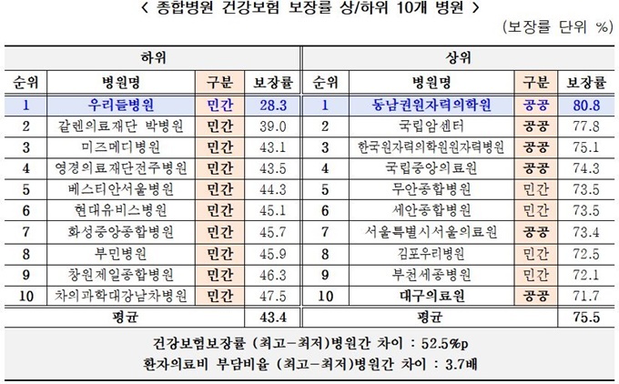 [µ¥Àϸ®¸Þµð °íÀç¿ì ±âÀÚ] »ó±ÞÁ¾ÇÕº´¿ø »çÀÌ¿¡¼µµ °Ç°º¸Çè º¸Àå·üÀÌ ‘¾à 26%’ °¡±îÀÌ Â÷À̰¡ ³´Ù´Â ÁÖÀåÀÌ Á¦±âµÆ´Ù. °æÈñ´ëÇб³º´¿øÀÇ °Ç°º¸Çè º¸Àå·üÀÌ ¾à 53%¿¡ ±×Ä¡´Â ¹Ý¸é, ȼøÀü³²´ëº´¿øÀÇ °æ¿ì ¾à 80%¿¡ ´ÞÇÑ´Ù´Â °ÍÀÌ´Ù.