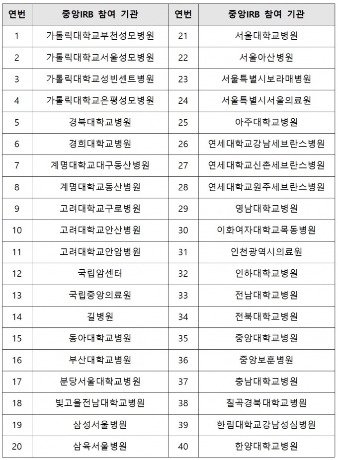 Áß¾ÓIRB¿¡´Â Äڷγª19 ¹é½Å µî ÀÓ»ó½ÃÇè ¼öÇà ±â°ü, ÀÓ»ó½ÃÇè ¼öÇà »óÀ§ ±â°ü µî ÃÑ 40°³ º´¿ø[Ç¥]ÀÌ Âü¿©ÇÒ ¿¹Á¤ÀÌ´Ù.