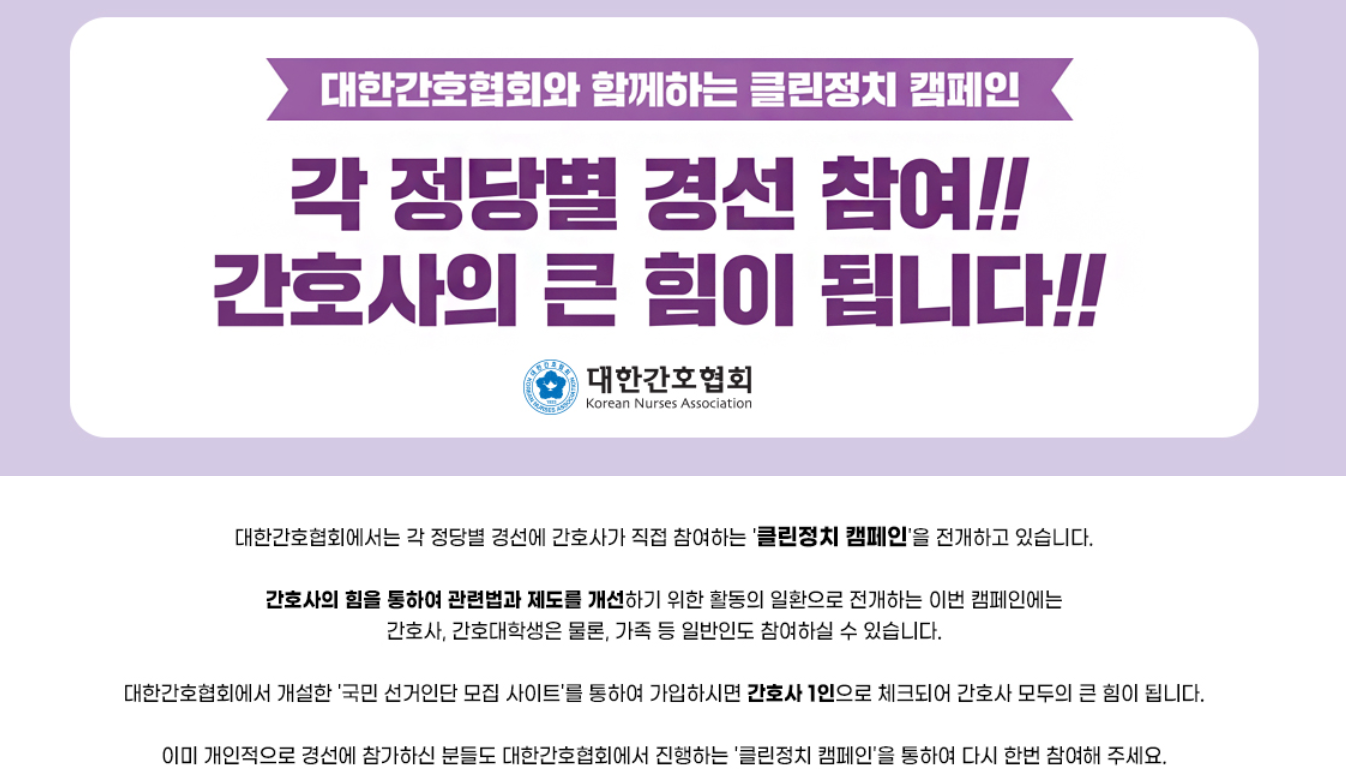 ÀÌ¿¡ ´ëÇѰ£È£Çùȸ(ȸÀå ½Å°æ¸²)´Â Ãֱ٠ȨÆäÀÌÁö¿¡ ‘°¢ Á¤´çº° °æ¼± Âü¿©! °£È£»çÀÇ Å« ÈûÀÌ µË´Ï´Ù!’¶ó´Â Á¦¸ñÀÇ °Ô½Ã±ÛÀ» ÅëÇØ ‘Ŭ¸°Á¤Ä¡ Ä·ÆäÀÎ’À» ÁøÇàÇϰí ÀÖ´Ù¸é¼ È¸¿øµé¿¡°Ô °¢ Á¤´çÀÇ ´ëÅë·É Èĺ¸ ¼±°ÅÀ뫆 ½ÅûÀ» ±ÇÀ¯Çß´Ù.