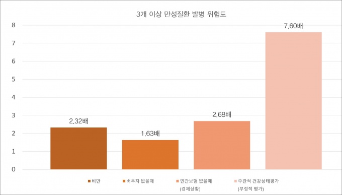 ¿¬±¸ÆÀÀº Á߳⠼ºÀο¡¼ 3°³ ÀÌ»ó ¸¸¼ºÁúȯÀÚ À§Çè ¿äÀεµ ºÐ¼®Çß´Ù. 40~44¼¼¿¡ ºñÇØ ³ªÀ̰¡ ¸¹¾ÆÁú¼ö·Ï ¸¸¼ºÁúȯ¿¡ °É¸± À§Ç輺ÀÌ ³ô¾Ò´Ù. ¡ãºñ¸¸ÀÏ ¶§ 2.32¹è ¡ã¹è¿ìÀÚ°¡ ¾øÀ» ¶§ 1.63¹è ¡ã¹Î°£º¸ÇèÀÌ ¾ø´Â °æ¿ì 2.68¹è ¡ãÁÖ°üÀû °Ç° »óŰ¡ ³ª»Ú´Ù°í Æò°¡ÇÑ È¯ÀÚ°¡ 7.60¹è À§Ç輺ÀÌ ³ô¼¼ ³ªÅ¸³µ´Ù.