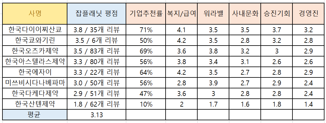 [µ¥Àϸ®¸Þµð ½ÅÁöÈ£ ±âÀÚ] ÀϺ»°è Á¦¾à»ç°¡ ´ëü·Î ‘´Ù´Ò¸¸ÇÑ È¸»ç’·Î Æò°¡µÈ °¡¿îµ¥ °¡Àå ÀÏÇϱâ ÁÁÀº ȸ»ç·Î´Â Çѱ¹´ÙÀÌÀÌÂî»êÄì·Î Á¶»ç. µ¥Àϸ®¸Þµð°¡ ÀϺ»°è Á¦¾à»ç 8°÷À» Áß½ÉÀ¸·Î ±â¾÷Á¤º¸ »çÀÌÆ® ÀâÇ÷¡´Ö ³» ÆòÁ¡ ¹× ¸®ºä¸¦ »ìÆìº» °á°ú, 8°÷ÀÇ Æò±Õ ÆòÁ¡Àº 3.13(5Á¡ ¸¸Á¡)À̾ú°í Çѱ¹´ÙÀÌÀÌÂî»êÄì°¡ 3.8Á¡À¸·Î °¡Àå ³ôÀº Á¡¼ö¸¦ ±â·Ï.