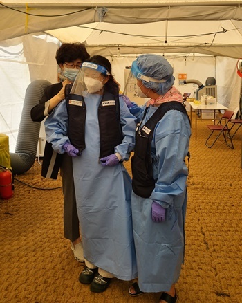 À±¼®¿Ï ÀÇÇù ºÎȸÀåÀº “±¹¹Î °Ç°À» À§ÇØ Àӽü±º°Áø·á¼Ò¿¡¼ °Ëü äÃë¿¡ ¸ÅÁøÇÏ´Â ÀÇ·áÁø¿¡°Ô µµ¿òÀÌ µÇ±æ ¹Ù¶ó´Â ¸¶À½¿¡¼ ¾óÀ½Á¶³¢¿Í ¼Õ ¼Òµ¶Á¦ µî ¹°Ç°À» ÁغñÇß´Ù”¸ç “ÀÇ·áÁøÀÌ °ËüäÃë¿¡ Àü³äÇÒ ¼ö ÀÖµµ·Ï Á¤ºÎ Â÷¿øÀÇ ¸¹Àº Áö¿øÀÌ À̾îÁö±æ ±â´ëÇÑ´Ù”°í ¸»Çß´Ù. |