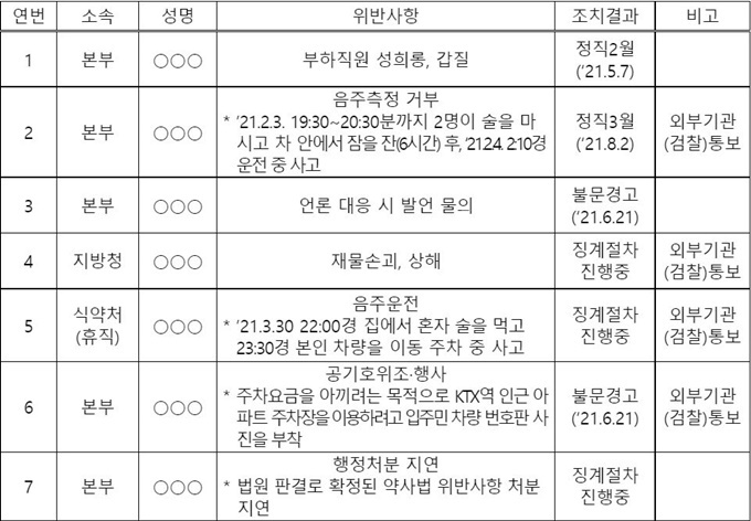 AÁ÷¿øÀº ºÎÇÏ Á÷¿ø¿¡ ´ëÇÑ ¼ºÈñ·Õ ¹× °©Áú·Î Áß¡°è¿¡ ÇØ´çÇÏ´Â Á¤Á÷ 2°³¿ù óºÐÀ» ¹Þ¾Ò´Ù. BÁ÷¿øÀº ÁÖÂ÷¿ä±ÝÀ» ¾Æ³¢±â À§ÇÑ ¸ñÀûÀ¸·Î KTX¿ª Àα٠¾ÆÆÄÆ® ÀÔÁֹΠÂ÷·® ¹øÈ£ÆÇ »çÁøÀ» ºÎÂøÇØ °ø±âÈ£ À§Á¶·Çà»ç µî ÀÚµ¿Â÷°ü¸®¹ý À§¹ÝÀ¸·Î ¡°è¸¦ ¹Þ¾Ò´Ù.
