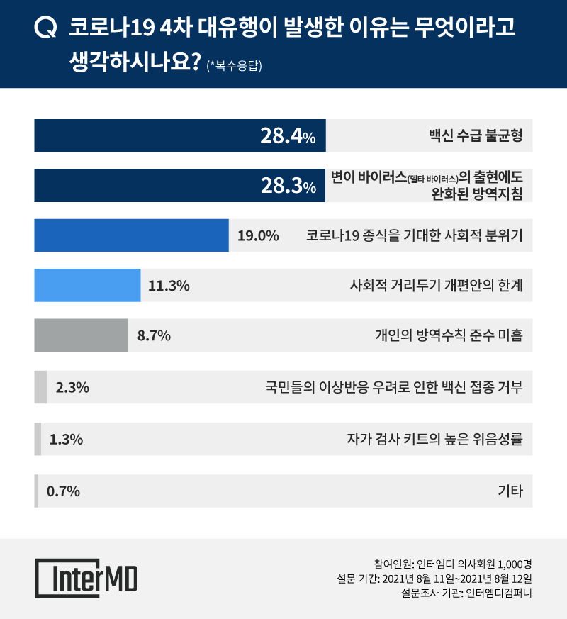 ¸ÕÀú Äڷγª19 4Â÷ ´ëÀ¯ÇàÀÌ ¹ß»ýÇÑ ÀÌÀ¯(º¹¼öÀÀ´ä)¿¡ ´ëÇØ ÀÇ»çµéÀº ’¹é½Å ¼ö±Þ ºÒ±ÕÇü’(28.4%)°ú ‘º¯ÀÌ ¹ÙÀÌ·¯½º(µ¨Å¸ ¹ÙÀÌ·¯½º) ÃâÇö¿¡µµ ¿ÏÈµÈ ¹æ¿ªÁöħ’(28.3%)À» °¡Àå ¸¹ÀÌ ²Å¾Ò´Ù.