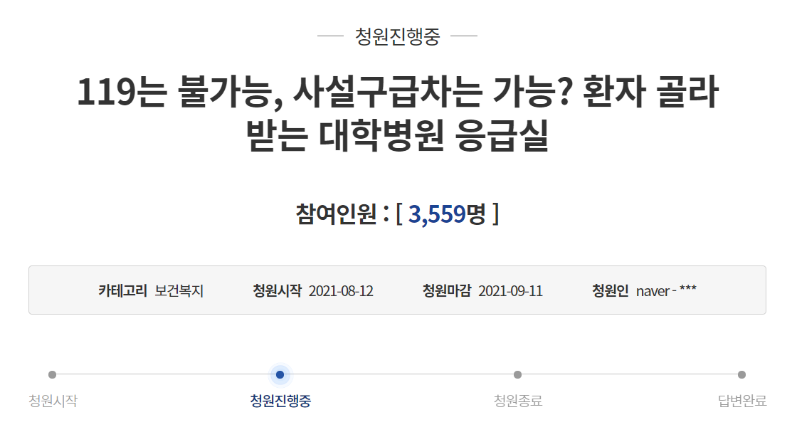 Ãֱ٠û¿Í´ë ±¹¹Îû¿ø °Ô½ÃÆÇ¿¡´Â ‘119´Â ºÒ°¡´É, »ç¼³±¸±ÞÂ÷´Â °¡´É? ȯÀÚ °ñ¶ó¹Þ´Â ´ëÇк´¿ø ÀÀ±Þ½Ç’À̶ó´Â Á¦¸ñÀÇ Ã»¿ø±ÛÀÌ °ÔÀçµÆ´Ù.