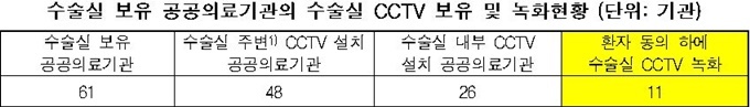 ƯÈ÷ ¼ö¼ú½Ç ³» CCTV¸¦ º¸À¯Çϰí ÀÖ´Â °ø°øÀÇ·á±â°ü 26°÷ Áß È¯ÀÚ µ¿ÀÇÇÏ¿¡ ¼ö¼ú½Ç ³»ºÎ CCTV ³ìȰ¡ ÀÌ·ïÁø ±â°üÀº 11°÷ÀÌ´Ù.