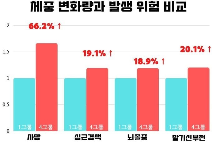 üÁß º¯µ¿ÀÌ °¡Àå Å« 4±×·ì(ºÓÀº»ö)Àº, °¡Àå üÁß º¯µ¿ÀÌ ÀÛÀº 1±×·ì(Ǫ¸¥»ö)¿¡ ºñÇØ »ç¸Á, ½É±Ù°æ»ö, ³úÁ¹Áß, ¸»±â½ÅºÎÀü ¹ß»ý À§ÇèÀÌ °¢°¢ 66.2%, 19.1%, 18.9%, 20.1% ³ô¾Ò´Ù.