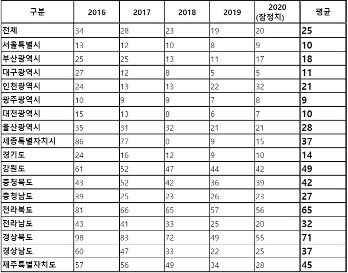 Áö¿ªº°·Î 119 ȯÀÚ 1¸¸¸í´ç DOA ȯÀÚ ÃÖ´Ù Áö¿ªÀº °æºÏ(71¸í)À̾ú°í, ÀüºÏ(65¸í), °¿ø(49¸í), Á¦ÁÖ(45¸í), ÃæºÏ(42¸í), ±¤ÁÖ(9¸í) ¼øÀ̾ú´Ù.