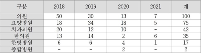 °°Àº ±â°£ ÀÇ·á±â°ü Á¾º°·Î´Â ÀÇ¿ø 100°Ç, ¿ä¾çº´¿ø 75°Ç, Ä¡°úÀÇ¿ø 42°Ç, ÇÑÀÇ¿ø 35°Ç, Çѹ溴¿ø 17°Ç, Á¾ÇÕº´¿ø 2°Ç µî ¼øÀ̾ú´Ù.