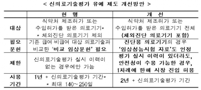 ¶Ç ±âÁ¸¿¡´Â ½ÅÀÇ·á±â¼ú Æò°¡¸¦ ¹ÞÁö ¾ÊÀº ÀÇ·á±â¼ú¸¸ À¯¿¹ ´ë»óÀ¸·Î Á¦ÇÑÇßÀ¸³ª, ¾ÕÀ¸·Î´Â ÀÌ¹Ì Æò°¡ ÀÌ·ÂÀÌ ÀÖ´õ¶óµµ ¾ÈÀü¼º Ãø¸é¿¡¼ ¼ö¿ë °¡´ÉÇÑ ¹üÀ§ÀÎ °æ¿ì 1Â÷·Ê¿¡ ÇÑÇØ ½ÃÀå ÁøÀÔÀ» Çã¿ëÇÑ´Ù.