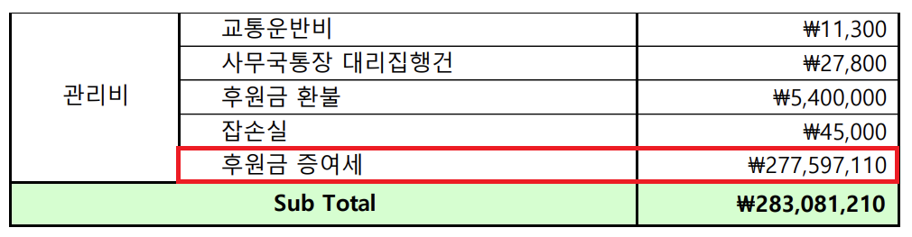±âºÎ±Ý ´ÙÀ½À¸·Î °¡Àå ¸¹Àº ±Ý¾×À» Â÷ÁöÇÑ ºÎºÐÀº ÃÑ 5°÷ ¹ý¹«¹ýÀÎ µî¿¡ ÀÚ¹®·á·Î »ç¿ëµÈ 1¾ï9593¸¸¿øÀ̾ú´Ù.