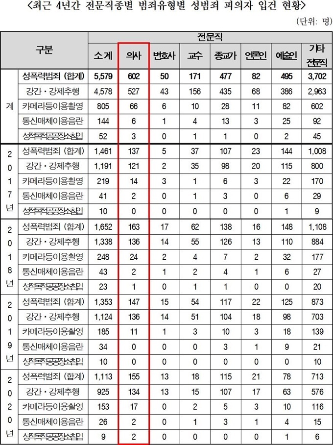 28ÀÏ ±¹È¸ ÇàÁ¤¾ÈÀüÀ§¿øÈ¸(Çà¾ÈÀ§) ÇѺ´µµ ´õºÒ¾î¹ÎÁÖ´ç ÀÇ¿øÀÌ °æÂûûÀ¸·ÎºÎÅÍ Á¦Ãâ ¹ÞÀº ÀÚ·á¿¡ µû¸£¸é 2017³âºÎÅÍ Áö³ÇرîÁö ÃÖ±Ù 4³â°£ ¼º¹üÁË·Î ÀÔ°ÇµÈ Àü¹®Á÷ Á¾»çÀÚ´Â 5579¸íÀ̾ú´Âµ¥, ÀÌÁß Àǻ簡 602¸íÀ¸·Î ÃÖ´Ù. ÀÇ»ç ¼º¹üÁËÀÚ´Â 2017³â 137¸í, 2018³â 163¸í, 2019³â 147¸í, 2020³â 155¸í µî.