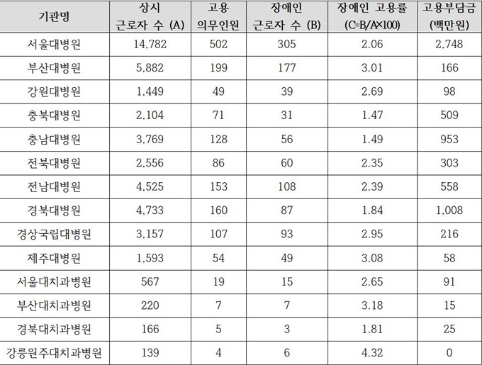¼¼ºÎÀûÀ¸·Î ¼¿ï´ëº´¿ø(Àå¾ÖÀÎ °í¿ë·ü 2.06·°í¿ëºÎ´ã±Ý 27¾ï4800¸¸¿ø), °æºÏ´ëº´¿ø(1.84%·10¾ï800¸¸¿ø), Ãæ³²´ëº´¿ø(1.49%·9¾ï5300¸¸¿ø), Àü³²´ëº´¿ø(2.39%·5¾ï5800¸¸¿ø), ÃæºÏ´ëº´¿ø(1.47%·5¾ï900¸¸¿ø), ÀüºÏ´ëº´¿ø(2.35%·3¾ï300¸¸¿ø), °æ»ó´ëº´¿ø(2.95%·2¾ï1600¸¸¿ø), ºÎ»ê´ëº´¿ø(3.01%·1¾ï6600¸¸¿ø) µîÀ̾ú´Ù.