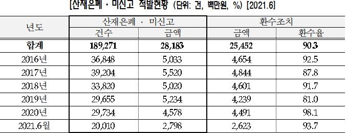 30ÀÏ ±¹È¸ º¸°Çº¹ÁöÀ§¿øÈ¸ ÃÖÇý¿µ ´õºÒ¾î¹ÎÁÖ´ç ÀÇ¿øÀÌ ±¹¹Î°Ç°º¸Çè°ø´Ü(°Çº¸°ø´Ü)À¸·ÎºÎÅÍ Á¦Ãâ ¹ÞÀº ÀÚ·á¿¡ µû¸£¸é ÃÖ±Ù 5³â°£ »ê¾÷ÀçÇØ¸¦ ÀÔ°íµµ ÀºÆóÇϰųª ¹Ì½Å°íÇØ Àû¹ßµÈ °Ç¼ö°¡ ÃÑ 18¸¸271°ÇÀ̾ú´Ù. ¿¬Æò±Õ ¾à 3¸¸4000°Ç(¾à 51¾ï¿ø), ÃÑ 281¾ï¿ø¿¡ ÇØ´çÇÑ´Ù.