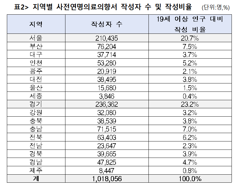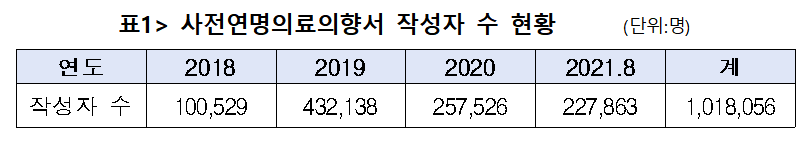 2018³â Çѱ¹º¸°Ç»çȸ¿¬±¸¿øÀÌ ¸¸ 40¼¼ ÀÌ»ó 79¼¼ ÀÌÇÏ ±¹¹Î 1500¸íÀ» ´ë»óÀ¸·Î ÇÑ ¼³¹®Á¶»ç¿¡ µû¸£¸é, ÀÀ´äÀÚÀÇ 75.7%°¡ ¿¬¸íÄ¡·á¸¦ ¹Ý´ëÇßÀ¸¸ç »çÀüÀÇÇ⼸¦ ÀÛ¼ºÇÒ ÀÇÇâÀÌ ÀÖ´Ù´Â ºñÀ²Àº Àüü 47.1%·Î ³ô°Ô ³ªÅ¸³µ´Ù.