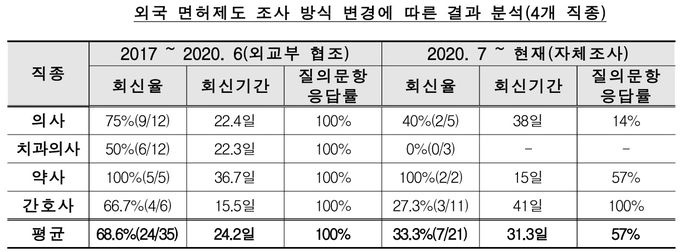 ½ÇÁ¦ Áö³ 1³â °£ ÇØ´ç ±¹°¡ ¸éÇãÁ¦µµ¿¡ ´ëÇØ ±¹½Ã¿øÀÌ ÀÚüÁ¶»çÇÑ °á°ú, ÁúÀǹ®Ç× ÀÀ´ä·üÀº ³·¾ÆÁö¸é¼ ȸ½Å±â°£µµ ±æ¾îÁö°í ÀÖ´Â °ÍÀ¸·Î È®ÀεƴÙ.
