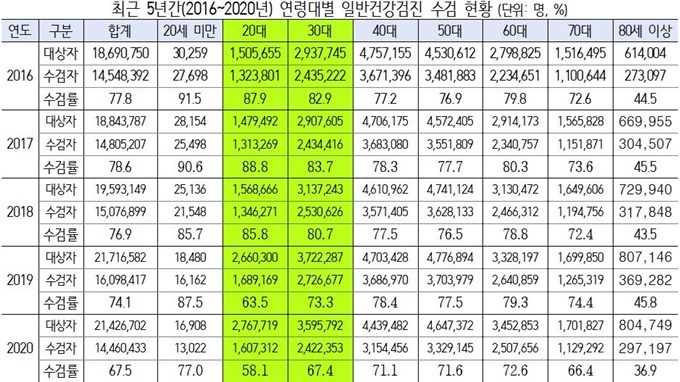 [µ¥Àϸ®¸Þµð °íÀç¿ì ±âÀÚ] Äڷγª19 ¿µÇâÀ¸·Î Àü ±¹¹ÎÀÇ °Ç°°ËÁø ¼ö°Ë·üÀÌ °¨¼ÒÇÑ °¡¿îµ¥, 20~30´ë û³âÃþ °Ç°°ËÁø ¼ö°Ë·üÀÌ ÃÖ±Ù 5³â°£ ‘¾à 22%’ Ç϶ôÇÑ °ÍÀ¸·Î ³ªÅ¸³µ´Ù.