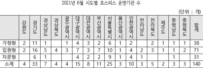 ¼¼ºÎÀûÀ¸·Î È£½ºÇǽº ÀÇ·á±â°ü 140°³ Áß ÀÔ¿øÇü 71°³, °¡Á¤Çü 38°³, ÀÚ¹®Çü 31°³´Ù. Áö¿ªº°·Î´Â °æ±â 33°³, ¼¿ï 25°³, ´ë±¸ 15°³, ºÎ»ê 11°³, ÀÎõ 10°³, ´ëÀü 8°³, °æ³² 7°³, ÀüºÏ 5°³, °¿ø·°æºÏ·±¤ÁÖ °¢ 4°³, ¿ï»ê·Àü³²·Ãæ³²·ÃæºÏ °¢ 3°³, Á¦ÁÖ 2°³ µîÀ̾ú´Ù.