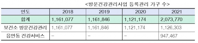 ¹æ¹®°Ç°°ü¸®»ç¾÷Àº Áö³ 2007³âºÎÅÍ °¢ Áö¿ªº¸°Ç¼Ò¿¡¼ ÁÖ¹ÎÀ» ´ë»óÀ¸·Î Á÷Á¢ °¡Á¤À» ¹æ¹®ÇØ Á¦°øÇÏ´Â °Ç°°ü¸®¼ºñ½º´Ù. ¿À´Â 2022³â±îÁö ³ëÀÎ 4¸í Áß 1¸í, 271¸¸ °¡±¸¸¦ ´ë»óÀ¸·Î ¼ºñ½º Á¦°øÇÒ °èȹÀÌ´Ù.