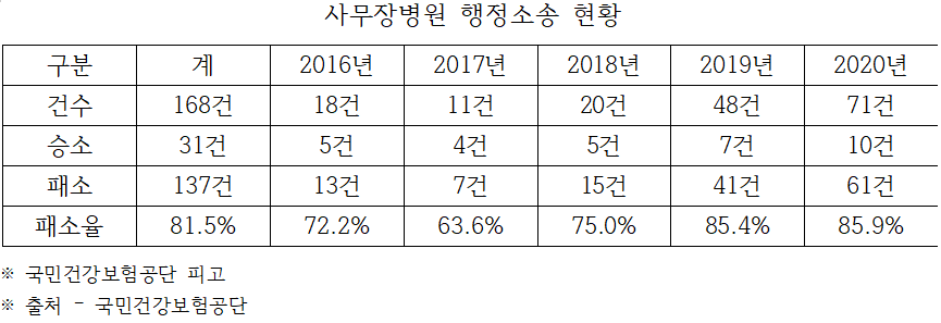 ±¹È¸ º¸°Çº¹ÁöÀ§¿øÈ¸ ÀÌÁ¾¼º ÀÇ¿ø(±¹¹ÎÀÇÈû)ÀÌ °Çº¸°ø´ÜÀ¸·ÎºÎÅÍ Á¦Ãâ¹ÞÀº ‘»ç¹«À庴¿ø ÇàÁ¤ÀçÆÇ ÇöȲ ÀÚ·á(2016³â~2020³â)’¿¡ µû¸£¸é, °¢ÇÏ ÆÇ°á µî °ø´Ü ÃøÀÌ »ç½Ç »ó ÆÐ¼ÒÇÑ °Ç¼ö´Â Àüü 168°Ç Áß 137°Ç(81.6%)¿´´Ù. ÆÐ¼ÒÇÑ ºÎ´ç±Ý¾× ±Ô¸ðµµ ¹«·Á 5541¾ï¿¡ ´ÞÇß´Ù.
